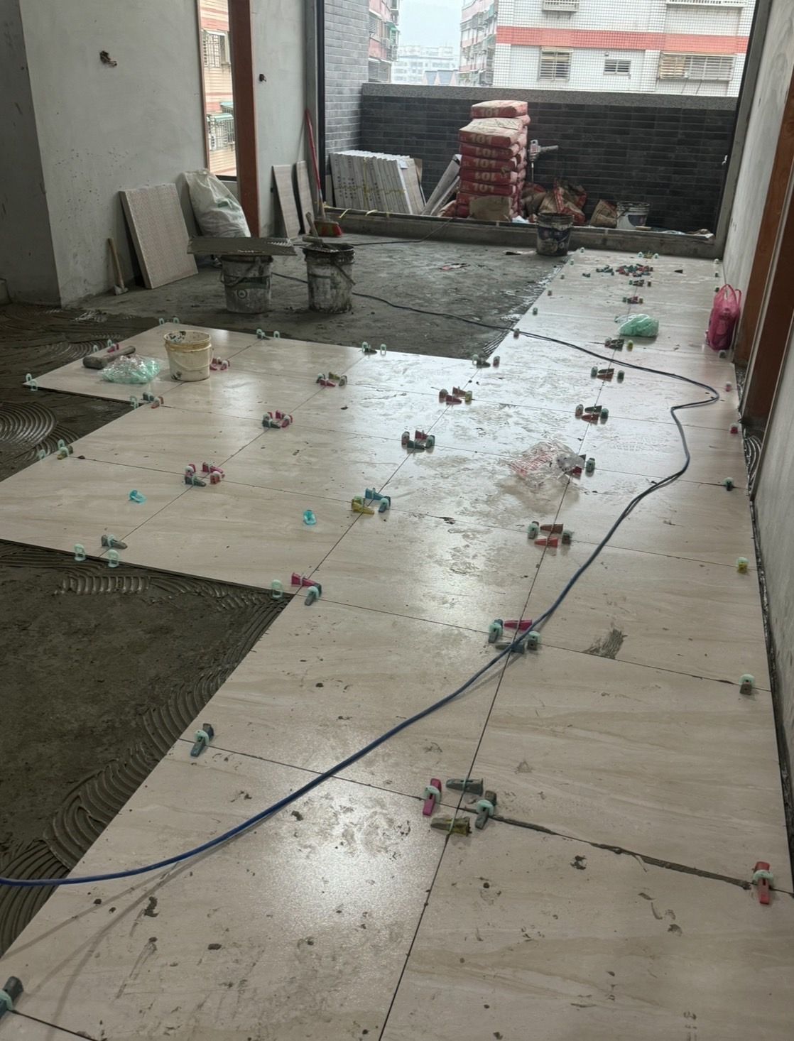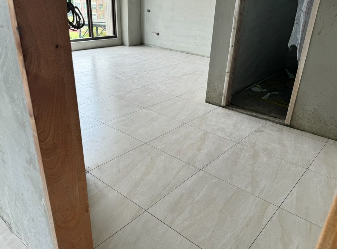 設計師使用賽洛斯降噪水泥砂漿打底,面材同時搭配木地板、花磚及拋光石英磚特有的紋理與色彩,使空間充滿溫暖且具有質感。簡潔的線條搭配舒適的家具配置,營造出開闊且放鬆的氛圍。